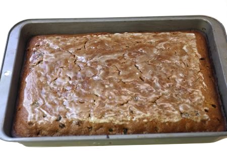 This was a Depression-era recipe. It uses no eggs, milk, or baking powder, but uses ingredients that were available at the time. The baking soda reacts with the boiled raisins to make the cake rise.