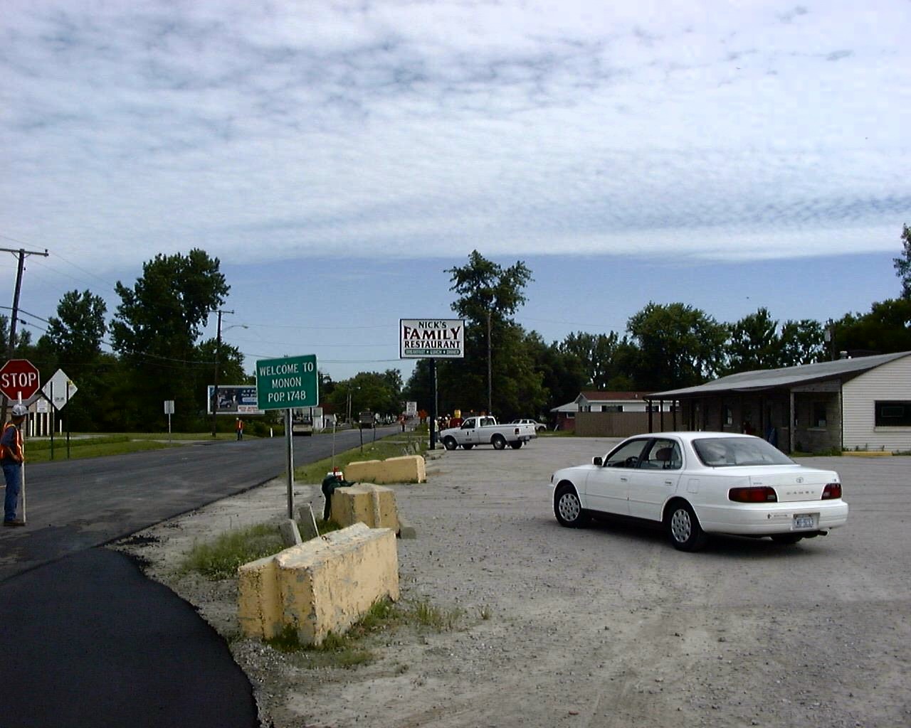 So I wanted to go back to Wisconsin, visit my aunt, and see if the things I remembered were still there. We decided to drive up there this summer of 2001. We live in Charlotte, North Carolina. We drove up through Kentucky, across the corner of Cincinnati, Ohio, and into Indiana. As we were driving north from Indianapolis I asked Pam to see if we were going anywhere near Monon, Indiana.